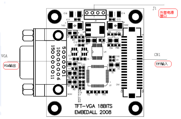 其中TFT 輸入為16或18位,而VGA輸出為標準的15-pinVGA輸出,支持的分辨率為: 1024 x 768, 800 x 600, 640 x 480!